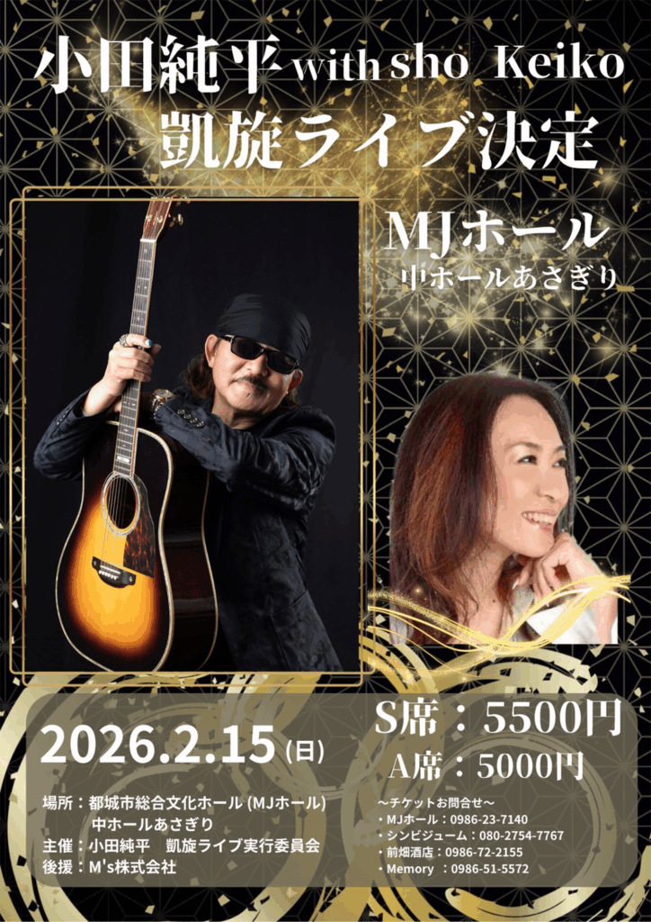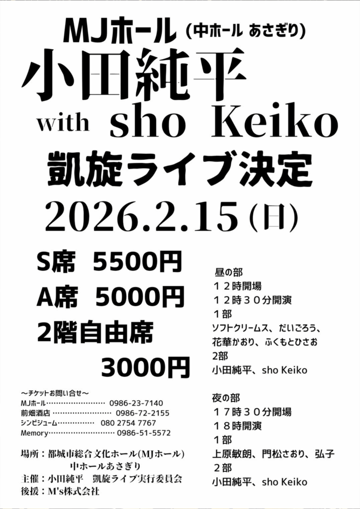 【チケット・お問合せ】☎0986-23-7140(MJホール) ☎0986-72-2155(前畑酒店)☎080-2754-7767(シンビジューム)☎0986-51-5572(Memory)